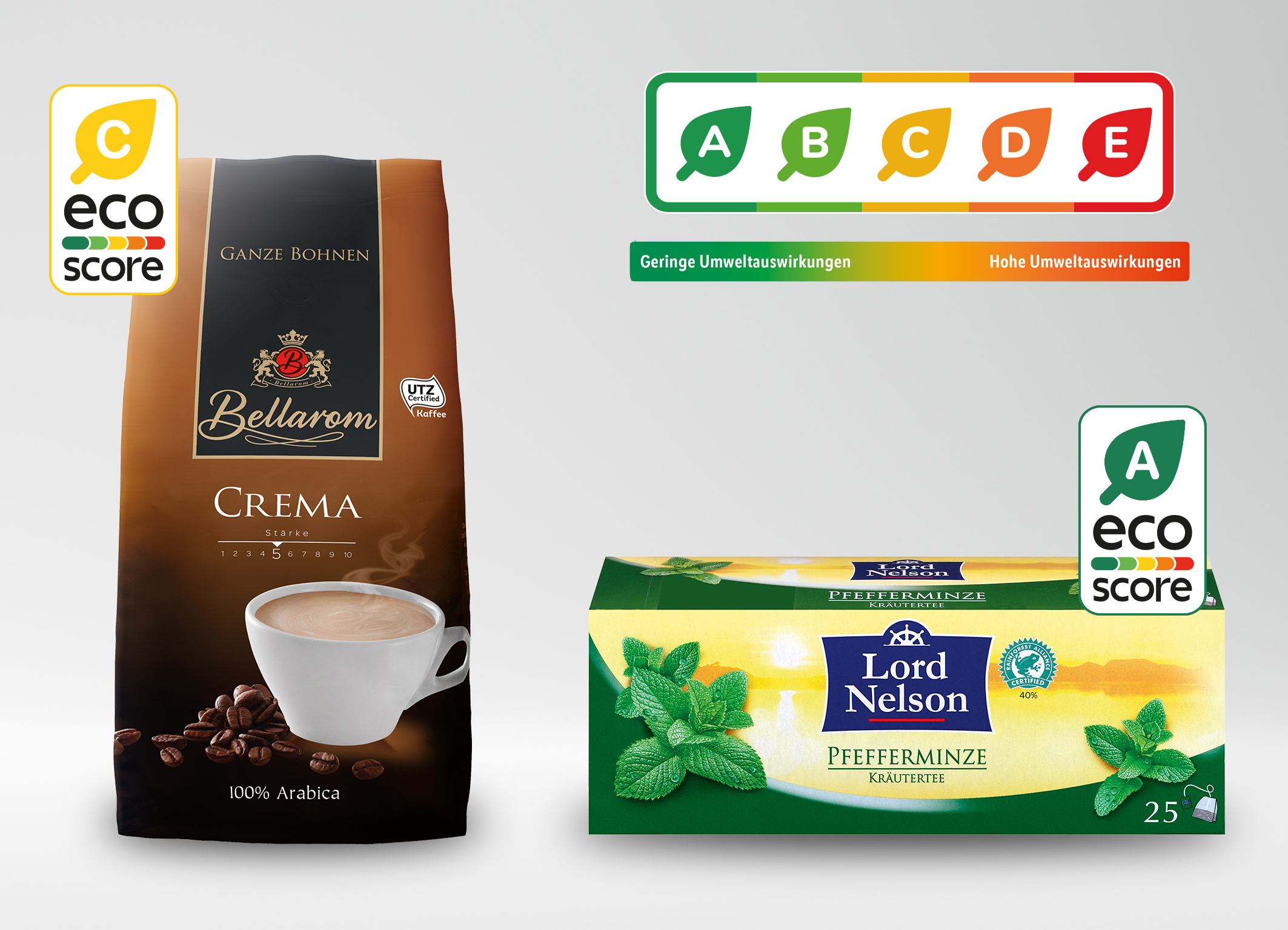 Mit der fünfstufigen Eco-Score-Produktkennzeichnung können Kundinnen und Kunden den Nachhaltigkeitsgrad von Lebensmitteln transparent auf einen Blick erkennen. Anhand des ökologischen Fußabdrucks und Kriterien wie Zertifizierungen, Herkunft oder Verpackung errechnet sich für den Eco-Score ein Wert auf einer Skala zwischen 0 und 100. Das jeweilige Ergebnis ergibt die Ampelkennzeichnung, die von einem dunkelgrünen A bis zu einem roten E reicht.
