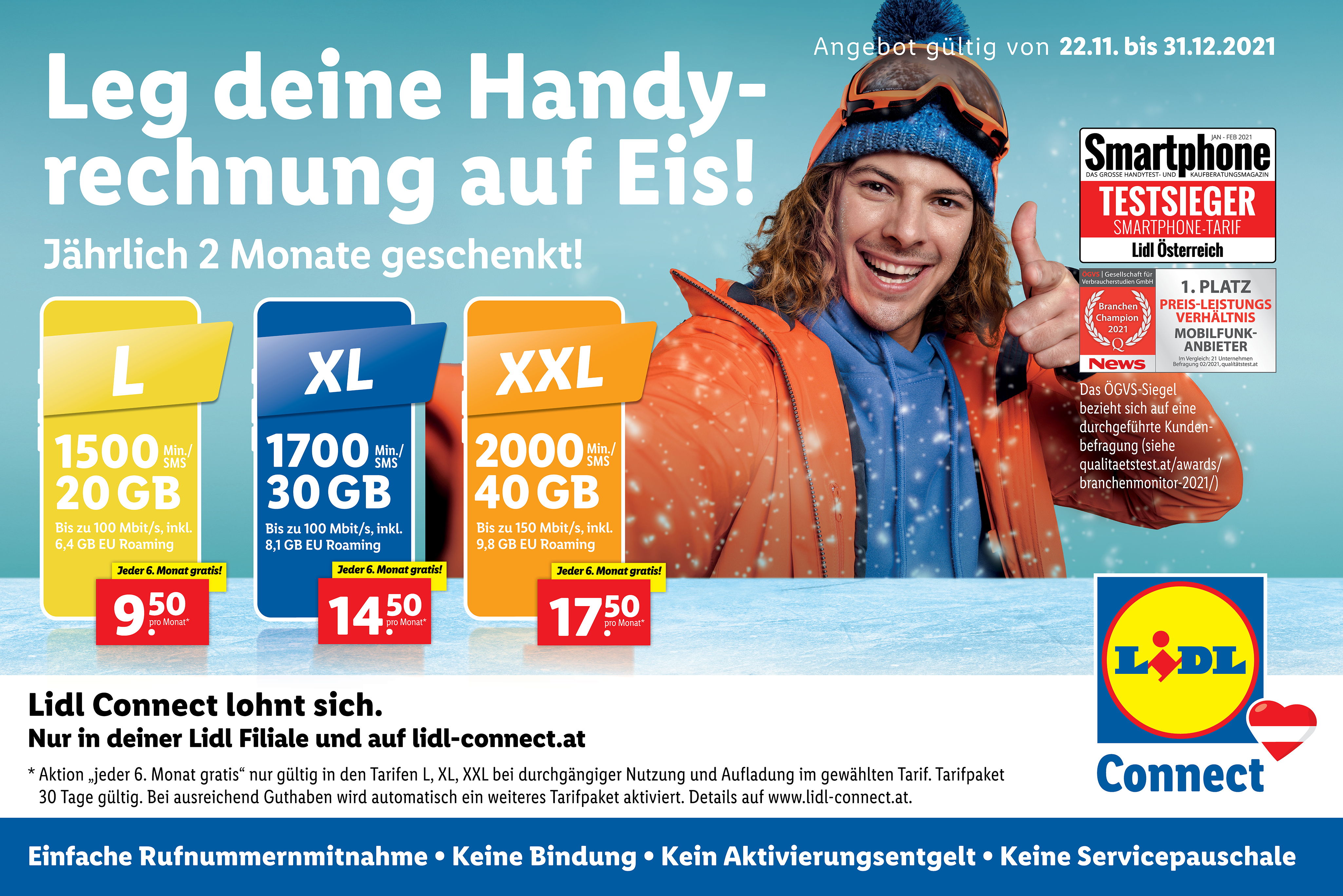 Zusätzlich gibt’s für Lidl Connect Kund:innen bei Anmeldung bis 31. Dezember 2021 jedes sechste Monat gratis – und das sogar bei allen Tarifen L, XL und XXL. Das bringt eine jährliche Ersparnis von bis zu 35 Euro. Alle Infos gibt’s auf www.lidl-connect.at