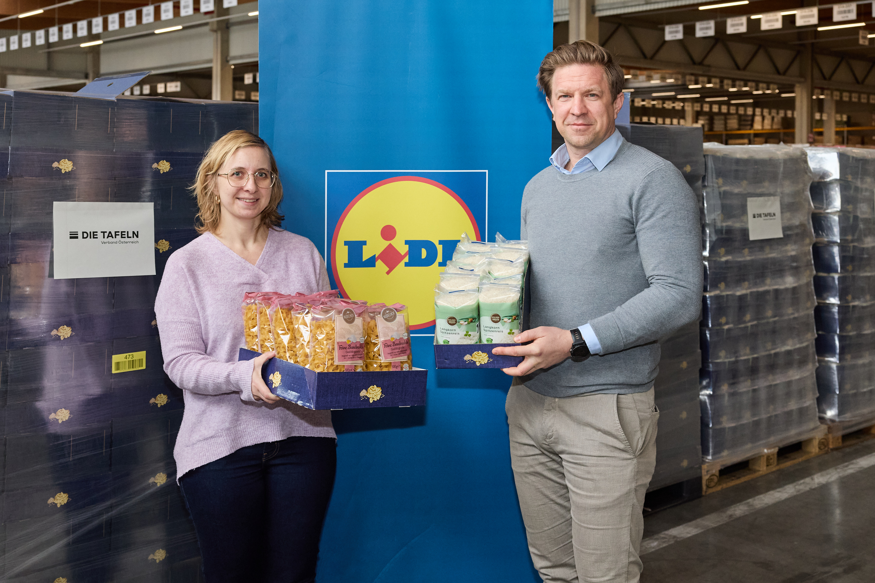 Erfolg für Lidl Spendensammelwoche: Insgesamt gingen über 16.000 Lebensmittel und Hygieneprodukte an den Verband der österreichischen Tafeln. Auf dem Bild (v. l. n. r.): Lea Laubenthal (Obfrau österreichische Tafeln), Michael Bogner (Geschäftsführer Lidl Österreich) (Abdruck für Pressezwecke honorarfrei, Fotocredit: Lidl Österreich)